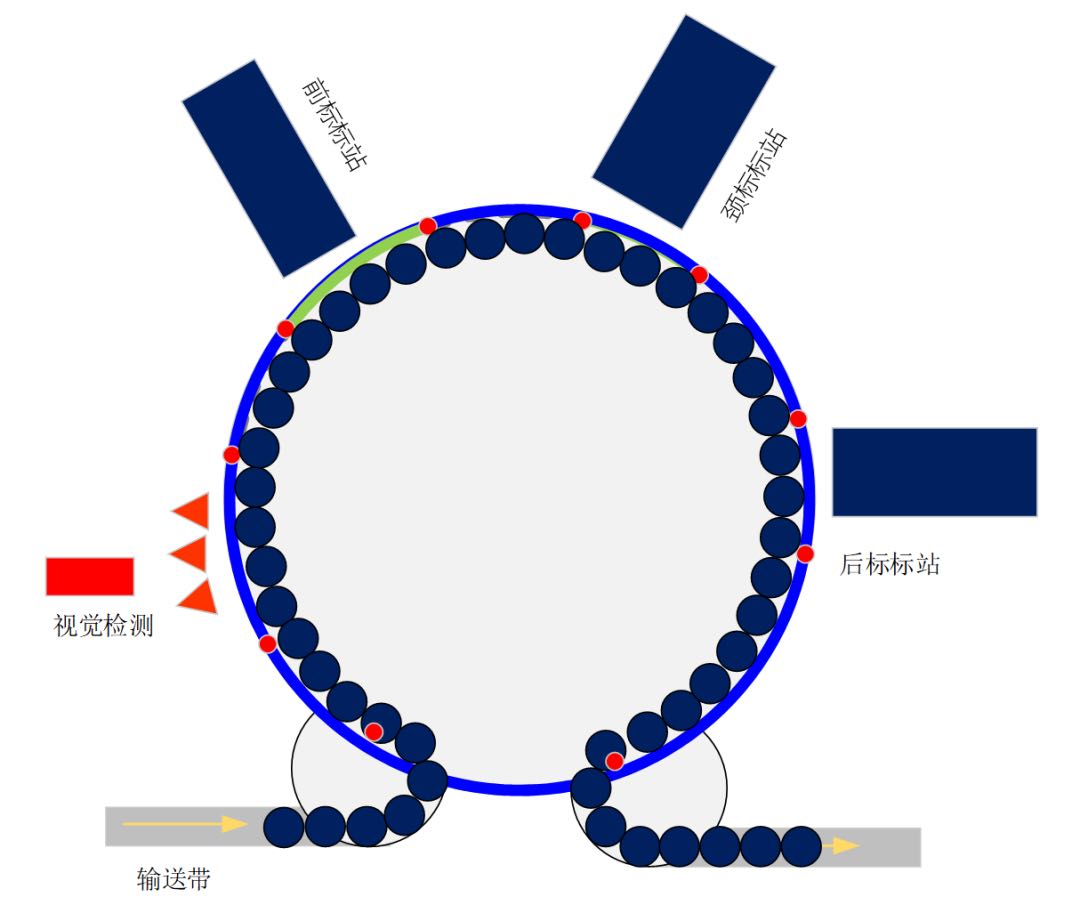 圖1是回轉貼標機的機械示意圖,它由大圓盤及在其上的托盤、標站構成,整個托盤圍繞著圓盤旋轉,而貼標站可以多個,并且可以是冷膠、熱熔膠、不干膠的多種形式,可以自由組合配對—根據貼標本身的需求。