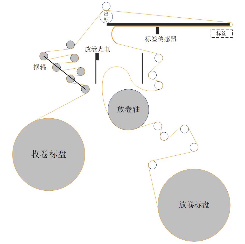圖4是送標機構的示意圖,它是將標簽放卷、牽引、送出、裁切的機構構成,可以由多種類型的標站,采用收放卷的高速運動控制技術來保障穩定的張力,以為精準送標、切標提供保障。