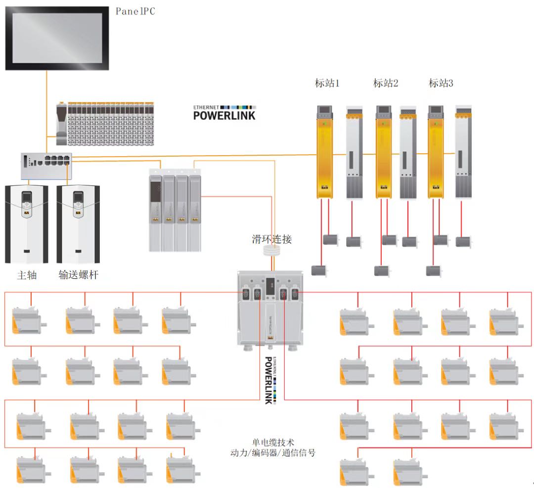 從圖5整個機器的配置可以看到,多達36個伺服電機,其高速同步性,由POWERLINK實時網絡來保障,達到百微秒級的任務周期。而另一方面采用ACOPOSmotor伺服驅動與電機一體的設計,也讓整個接線變得更少,且空間緊湊,易于機械的安裝維護。
